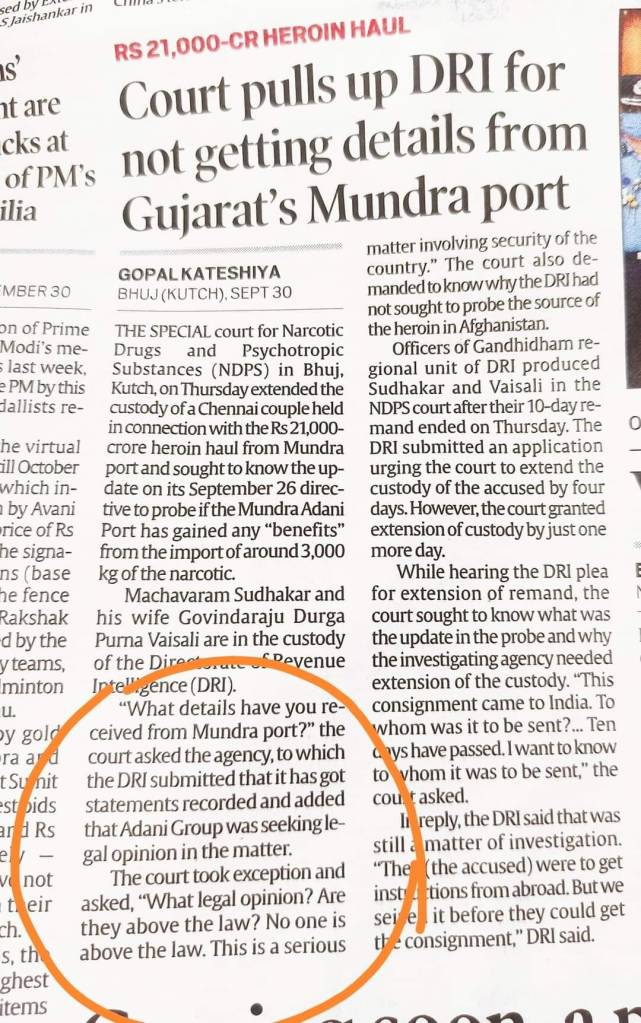 पेडिग्री मीडिया ने आज यह खबर दबा दी। कल स्पेशल कोर्ट ने जब रेवेन्यू इंटेलिजेंस निदेशालय (DRI) के अफसरों से गुजरात के मुंद्रा पोर्ट पर उतरे 21000 करोड़ के ड्रग के मामले में डिटेल मांगी, तो जवाब क्या मिला पढ़िए।