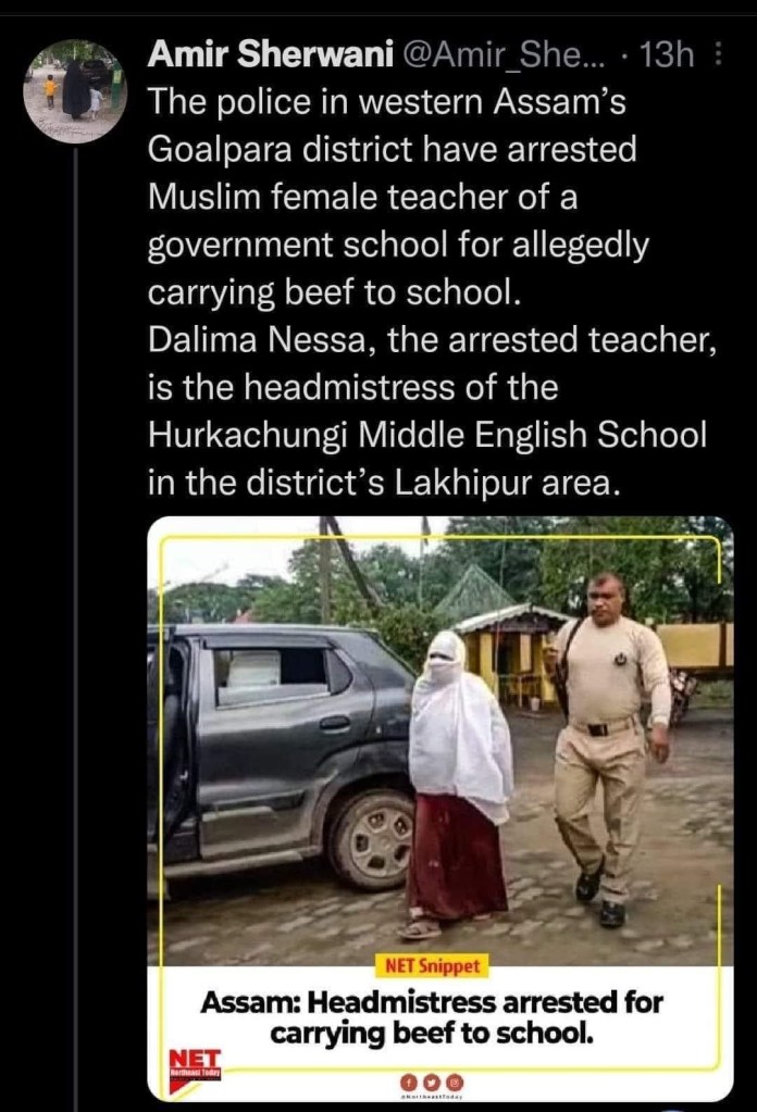 Today, at least 10 people died due to flooding in Assam. Over 200,000 people have been affected. And yet, what do Hindutva goons do? They have a school principal arrested on suspicions of eating beef, a reportedly conventional food item in the region.
