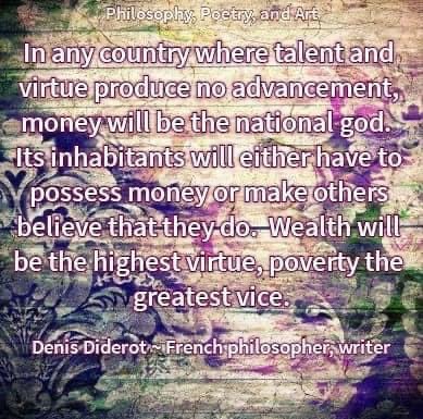 “In any country where talent and virtue produce no advancement, money will be the ultimate God. Its inhabitants will either have to possess money or make others believe that they do. Wealth will be the highest virtue, poverty the greatest vice.”