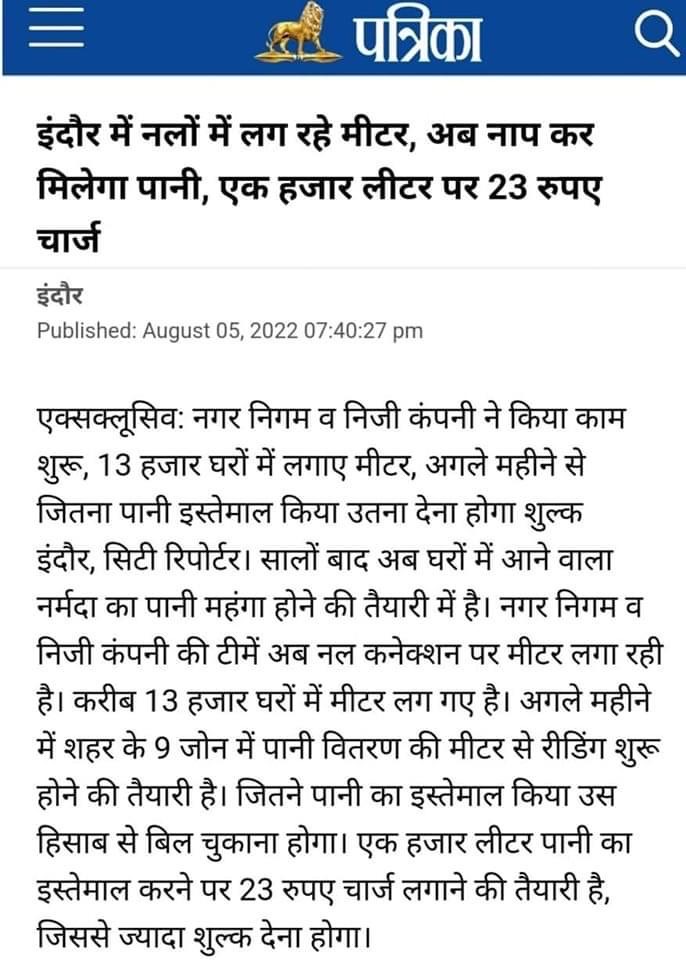 जिस तरह से बिजली के स्मार्ट मीटर लग रहे हैं वैसे ही आने वाले दिनों में जल प्रदाय के भी स्मार्ट मीटर लगने शुरू हो जाएंगे, मोदी सरकार अंदर ही अंदर तेजी से तेजी से जल के निजीकरण पर काम कर रही है