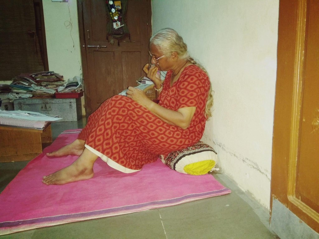 यह मेधा पाटेकर हैं। अपने ऑफिस में अपने बिस्तर पर बैठी दाल-रोटी खा रही हैं। यह कमरा उनके सोने का भी कमरा है, उनके पढ़ने का भी और उनका ऑफिस भी। उनका बिस्तर है- जमीन पर एक चटाई, एक तकिया, एक चादर। बाकी कमरा कागजात और किताबों से भरा।