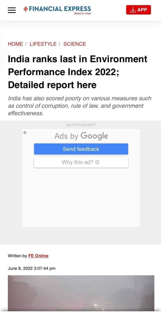India has finished at the bottom of the Environment Performance Index-2022 released by the World Bank. This means India is among those countries in the world that have the worst environmental health. Out of 180 countries that have been ranked, India is in the bottom five with a score of 18.9. Even Bangladesh, Myanmar, Pakistan, and Vietnam have ranked better than India 😔