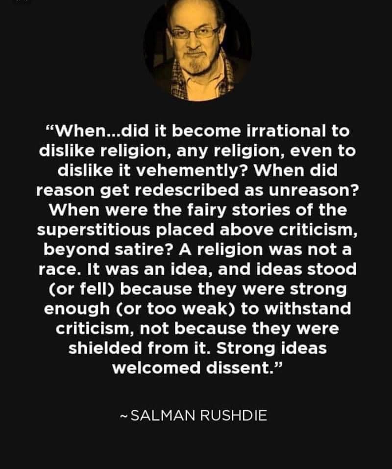 Today, I am deeply saddened by the attack on Salman Rushdie, one of my most beloved writers. I’m relieved he will not lose his life, and appalled that he has had to be put on a ventilator and may lose an eye. Salman Rushdie is the same age as my parents. His attacker is a 24 year old man. Can a mindset that justifies such brutality against a man old enough to be your grandfather really be equated with religion?
