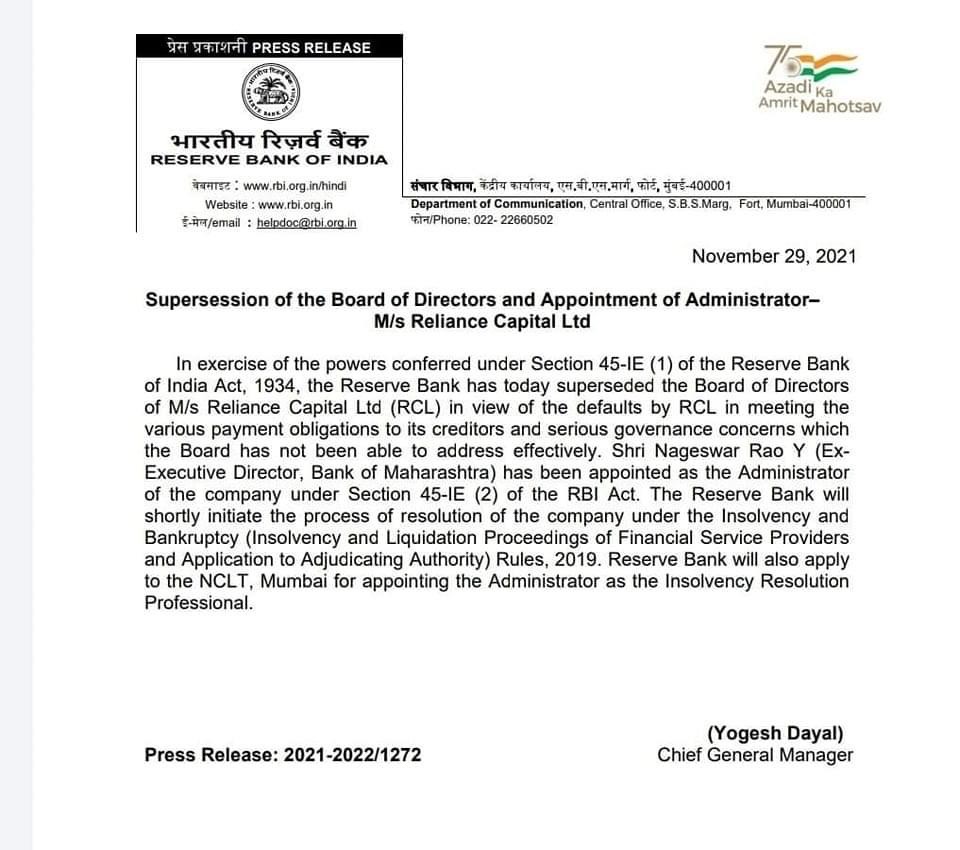 आज रिज़र्व बैंक ने रिलायंस कैपिटल का टेक ओवर कर लिया है।
