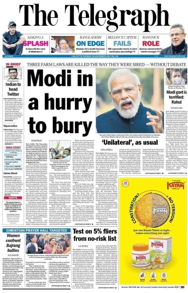कोई भी मीडिया समूह आपको यह बात नही बता रहा है कि कि नरेंद्र मोदी की सरकार नवम्बर के अंत मे अपने ढाई साल पूरे करने जा रही है यानी नरेंद्र मोदी को प्रधानमंत्री बने पूरे साढ़े सात साल पूरे हो गए हैं, नरेंद्र मोदी ने 30 मई, 2019 को प्रधानमंत्री के रूप में दूसरी बार शपथ ग्रहण की थी 30 नवम्बर 2021 को उनकी दूसरी टर्म के ढाई साल पूरे हो गए हैं…….